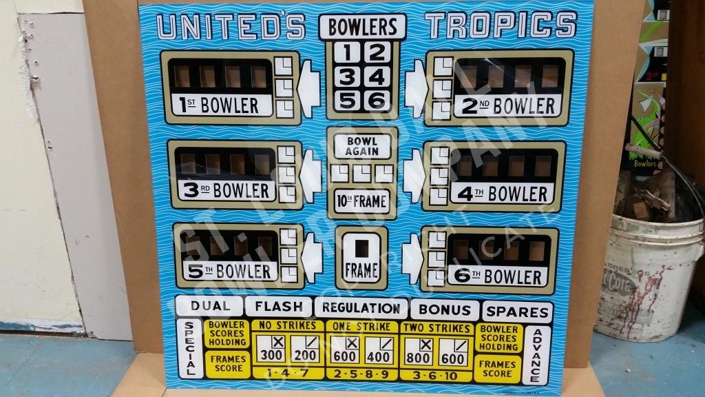 This is a new reproduction of the 1962 United Tropics Upper Backglass. We ship everything UPS.
